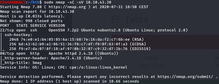 First, we need to scan with nmap, as always : We see http and ssh. The apache webserver isn’t vulnerable and ssh isn’t either. Let’s run an nmap scan on all ports in the background, just in case :