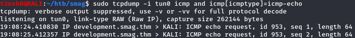 I try to ping my machine, just to see if it works, I use tcpdump to listen for incoming ping request : sudo tcpdump -i tun0 icmp and icmp[icmptype]=icmp-echo