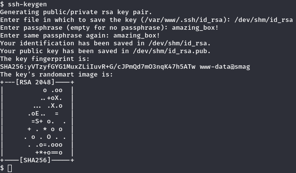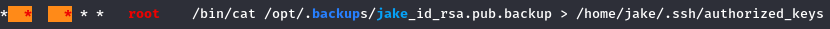 I do like this because here, no file is getting downloaded and it’s invisible for the user. After looking at the output ( it took some time ), I noticed a crontab executed by root : The root user is copying this file to jake’s authorized_keys We have write access to the /opt/.backups/jake_id_rsa.pub.backup file, so we can put our own .pub file here, and then connect to Jake with ssh ! Let’s go to /dev/shm ( because we always have write access into it ) and use ssh-keygen.