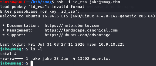 Copy the id_rsa private key to our machine, wait a bit, then connect with ssh to jake’s account :